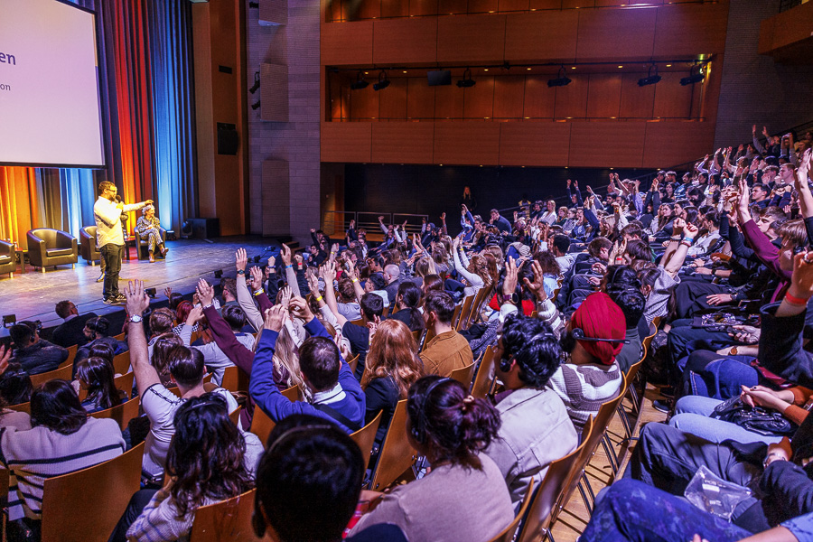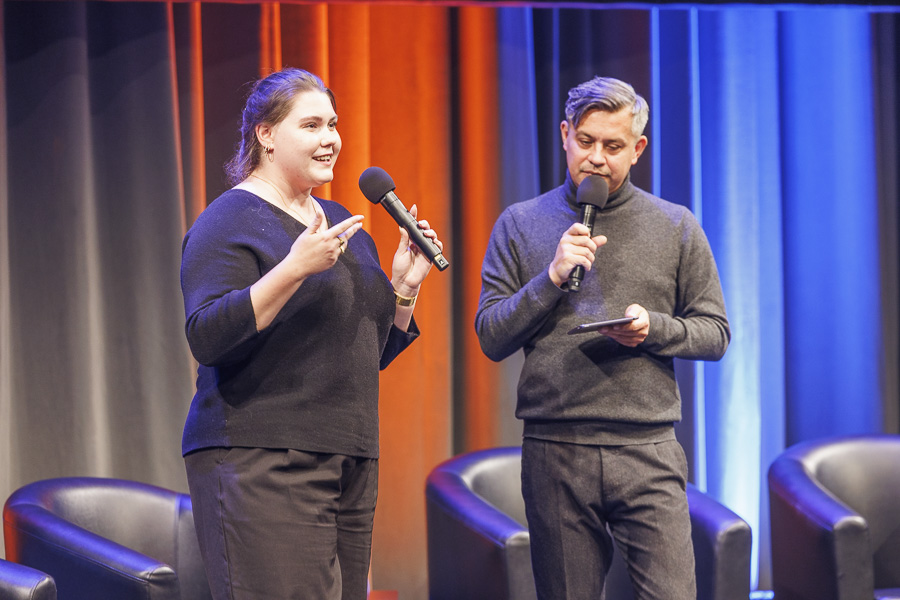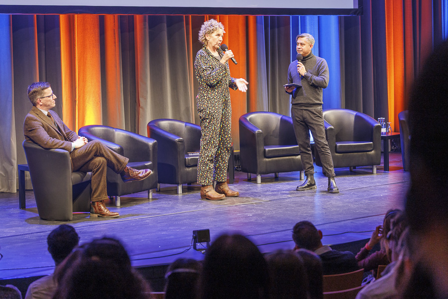 Am Nachmittag haben sich dann schon die ersten Gruppen gefunden. Gemeinsam strömen sie zum Get-together, zu dem die Viadrina, die Stadt und das Kleist Forum einladen. In einem kulturellen Speed-Dating stellt der Autor Ken Yamamoto Frankfurts Bürgermeister Claus Junghanns, Viadrina-Vizepräsidentin Janine Nuyken, Studentin Laura Noethe, Frederic-Marc Jürgensen, Geschäftsführer des Stadtsportbundes, und Daniel Heinz, künstlerischer Leiter des Kabaretts „Oderhähne“ vor – und gibt durch diese Personen der Stadt und der Europa-Universität Gesichter. Alle Redner*innen auf der Bühne ermuntern die Zuschauer*innen im Saal, sich voller Neugier und ohne Scheu der Stadt und der Uni zu widmen. „Ihr könnt hier viel mitgestalten; ihr müsst nicht lange fragen, ob das jemanden stört, einfach machen!“, appelliert Claus Junghanns. Dass Frankfurt nicht gleich durch überbordende Schönheit auffalle, gibt Janine Nuyken zu. „Aber Frankfurt kann man erleben, auf den zweiten Blick entdecken und mitgestalten – deswegen ist es der ideale Ort für die Viadrina“, sagt sie.