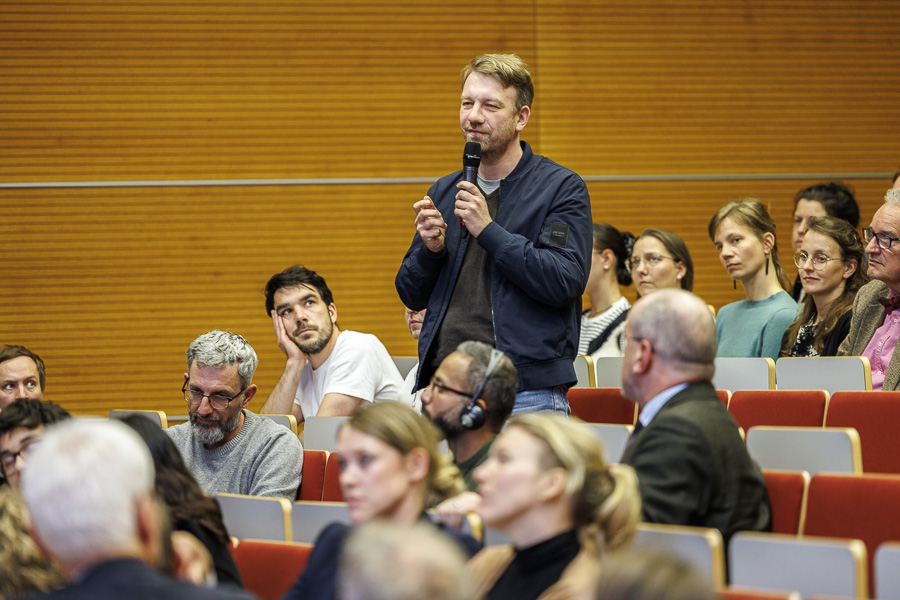 In einem lebhaften Austausch zwischen Podium und Gästen drehten sich viele weitere Publikumsfragen um Themen wie den Mehrwert von KI, Kreativität und KI, Bekämpfung von sozialen Ungleichheiten durch KI oder KI in der Schule. Es sei ein Gewinn jeder guten akademischen Debatte, mehr Fragen hinzugewonnen zu haben, resümierte Philipp Hacker abschließend und verwies auf die Fortführung des gelungenen Auftakts der Viadrina Debate zu Beginn des kommenden Sommersemesters im April 2026. Was KI übrigens nicht könne, sei Häppchen essen, fügte Hacker humorvoll hinzu und leitete zum geselligen Ausklang im Foyer des Audimax über.