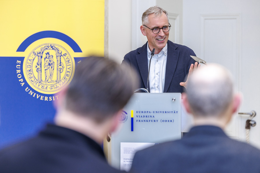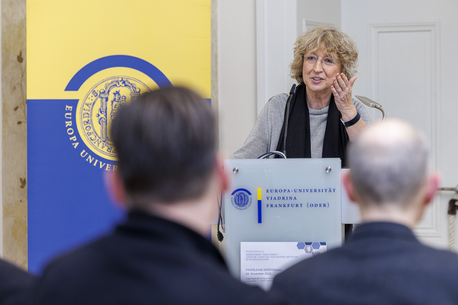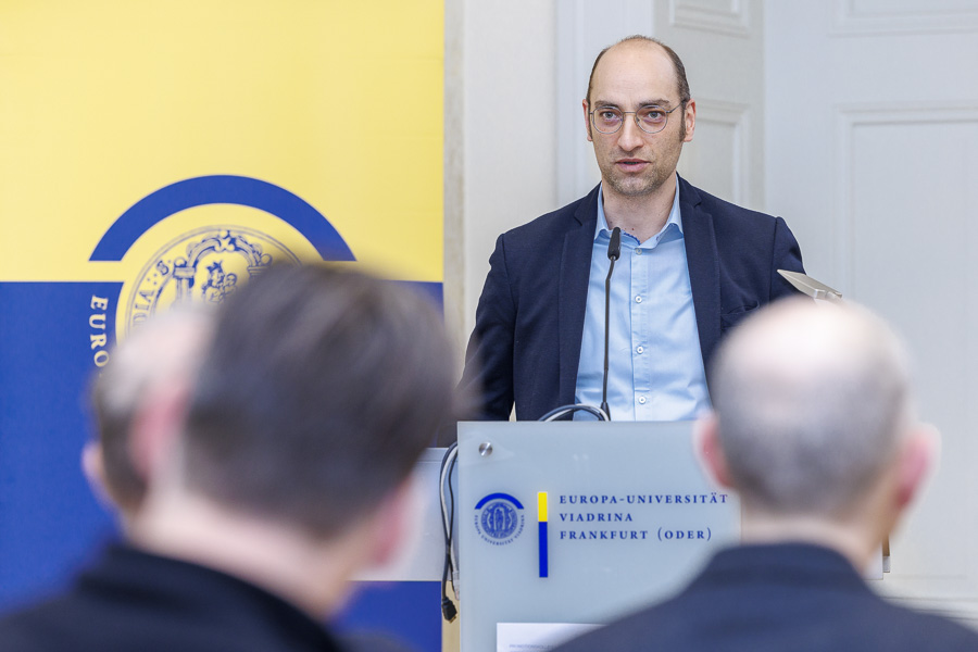 „Warum entscheiden Sie sich für die Bedeutungslosigkeit, statt mitzuschreiben am Algorithmus der Zukunft?“, fragte Prof. Dr. Christoph Brömmelmeyer, Vizepräsident für Forschung an der Viadrina, provokant in Richtung der Stipendiat*innen des Kollegs. Angesichts einer aktuell vielfach betriebenen Demontage der Geisteswissenschaften halte er es für erstaunlich, dass sich „junge Leute“ auf das Thema des Kollegs einlassen, stichelte er weiter, um dann schnell einzulenken: „Wie sehr ich Sie beneide!“ Gar nicht aus der Zeit gefallen sind schließlich die Themen, mit denen sich die Promovierenden beschäftigen, etwa den subversiven Schreibstrategien jüdischer Autor*innen. Mit denen ließe sich auch eine Künstliche Intelligenz überlisten, um Widerstand zu verschlüsseln, überlegte Brömmelmeyer. Schließlich betonte er, dass die nun entstehenden Arbeiten über jüdische Kulturschaffende der NS-Zeit auch dazu beitragen, „dass wir Verantwortung dafür tragen, dass sich die Schicksale nicht wiederholen“.