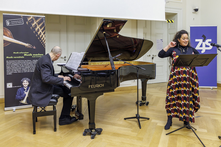Der Eröffnungsabend endete mit einem Konzert der Sopranistin Tehila Nini Goldstein und Jascha Nemtsov am Klavier. Sie interpretierten in ihrem Programm „Auf den Flügeln jüdischen Gesangs: Jüdische Musik in Zeiten von Verfolgung“ Werke jüdischer Musiker*innen aus den 1930er- und 1940er-Jahren.