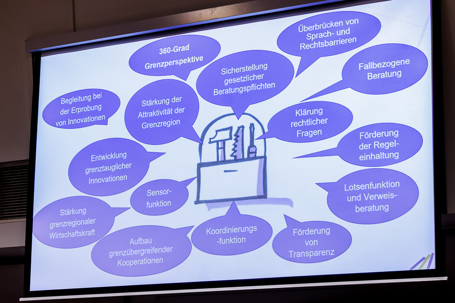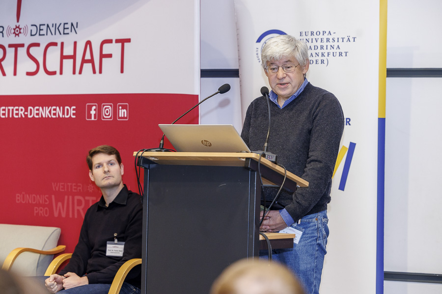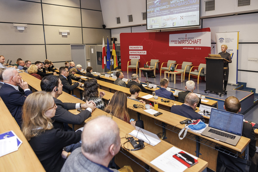 Vor diesen abschließenden Worten hatten Vertreter*innen aus Wirtschaft und Wissenschaft in drei Gesprächsrunden unter anderem über Arbeitsmigration, grenzüberschreitende Verkehrs- und Energie-Infrastruktur und vielfältige Kooperationen gesprochen. Deutlich wurden dabei die vielschichtigen Ebenen der Zusammenarbeit – von Kulturprojekten und Schulpartnerschaften über pendelnde Arbeitnehmer*innen bis zu Großprojekten wie einem gemeinsamen Fernwärmenetz. So sprach beispielsweise Migrationsforscher Dr. Norbert Cyrus in einer von Viadrina-Wirtschaftswissenschaftler Prof. Dr. Fabian Bald moderierten Runde über die vom Viadrina Center B/ORDERS IN MOTION wissenschaftlich begleitete Einführung von Grenzinformationspunkten. Diese dienen dazu, Deutsche und Pol*innen bei grenzüberschreitenden Aktivitäten zu beraten.